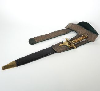 um 1900, Jagd/Forstbeamte, blanke Klinge, Horngriff mit Messingknöpfen, -parierstange und -abschluß, Lederscheide mit Messingbeschlägen, L über alles ca. 55,5 cm, Gehänge mit Gürtel (Dorne fehlen)