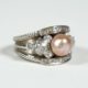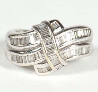 verlaufende Schiene, zentral Diamanten in Baguetteschliff, Kanalfassung, ca 10,88gr 750er WG (getestet) total, Ringgröße 56