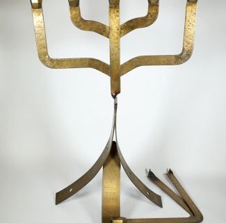 Messing, Hammerschlagdekor, 3-beinig, im mittleren Segment Davidstern hebräische Inschrift u Widmung „Ihre Fährleute“, ca. 100 x 85 bzw. 61 x 35 cm, 2 Leuchterarme lose anbei (laut Aussage des Einlieferers Nachlass Berthold Beitz)
