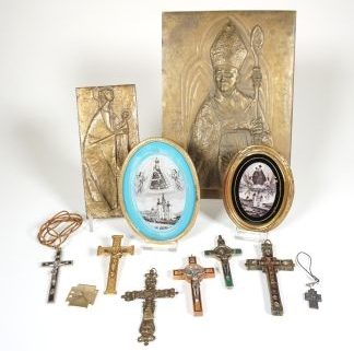 bestehend aus: 2 Reliefplaketten, Bronze (F.X. Hons bzw. Besuch Papst Johannes Paul II. Östereich 1988), ca. 23,5 x 16 bzw. 16,5 x 7 cm; 2 Andenkenbildchen Maria Zell, je ovale Rahmen, ca. 12,5 x 9,5 bzw. 11 x 8,5 cm; 7 Kreuzanhänger/Umhängekreuze (1x beschädigt); 1 Reverskreuz