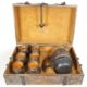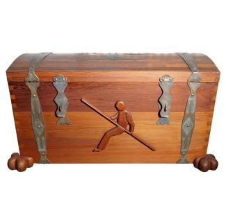 Geburtstaggeschenk für Berthold Beitz zun 70.Geb., gestiftet von „Die Fährleute“, versch. Vollhölzer, im Deckel Dank- u Sinnspruch, sowie Symbol der Waage (Messing), in der Front stilisierte Figur eines Fährmanns, Messingbänder u – beschläge, seitlich Griffe, über alles ca. 70 x 128 x 65 cm, (Nachlass Berthold Beitz)