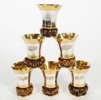 Satz von 6 Herst. Weeber & Heidegger/Pforzheim, Glockenform, leichter Hammerschlagdekor, Eigentümermonogr. BB, in der Basis Rosen vom Damwild, Lippe, Stand und innen vergoldet, Anlaufgeschützt, zus. ca. 373g total 925er-Silber, MZ, Beschau, H ca. 6 cm (Nachlass Berthold Beitz)