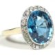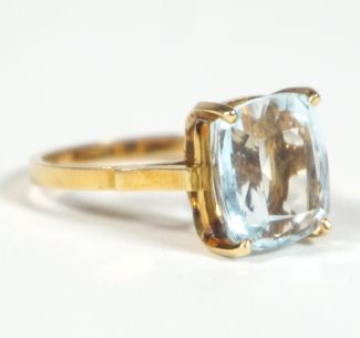 zentral Aquamarin im Ceylon-Schliff, à ca 5ct, Krappenfassung, MZ, Beschau, ca 4,44gr 585er GG total, Ringgröße 57