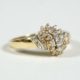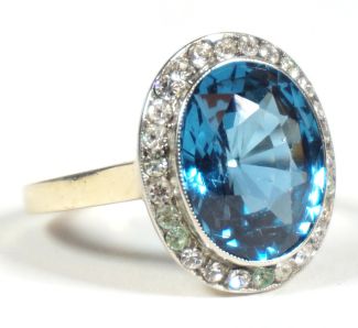 zentral Blautopas in Ovalschliff, WG-Zargenfassung, gerahmt von Diamantsimilesplittern (einer fehlt), Beschau, ca 4,06gr 585er WG/GG total, Ringgröße 53
