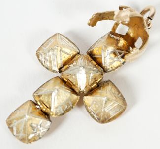 Manuf J.H.W./England, Silber vergoldet, 4armige Fassung mit Öse, Kugelelemente ausklappbar, pyramidenförmige Segmente ergeben Kreuz, diese graviert mit Freimaurersymbolen, über alles 5 x 2,7 cm, Kugeldm. 1,5 cm, MZ, bez.