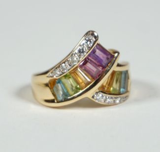 verlaufende Schiene, zentral variierende Farbsteine in Baguetteschliffen (1x hellblauer Stein außen repariert), Kanalfassung, zus ca 2,08ct, flankiert von 8 Diamantsplittern (zus ca 0,12ct), Beschau, ca 5,52gr 585er GG total, Ringgröße 54, Gebrauchsspuren