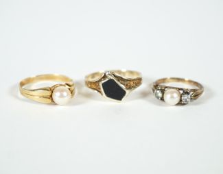 Konvolut von 3, 2x zentral Perle, 1x flankiert von zwei Glassteinchen, 1x Onxyplättchen, je Beschau, zus ca 7,56gr 585er Gold total, Ringgröße 60, 59 und 51