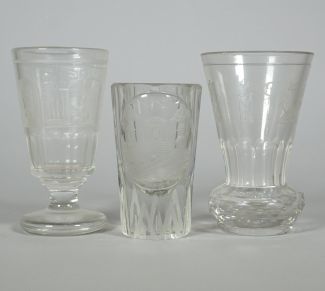 Konvolut von 3, farbloses Glas, je in der Wandung Freimaurersymbole, 1x im Boden Gravur in Spiegelschrift, H. 11 bis 13,5 cm, leichte Gebrauchsspuren, ein Stand mit Flohbiss