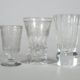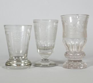 Konvolut von 3, farbloses Glas, je in der Wandung Freimaurersymbole, H. 11 bis 13 cm, Gebrauchsspuren, zwei Gläser mit je einem Chip an Lippe (1x innerhalb der Glasmasse)