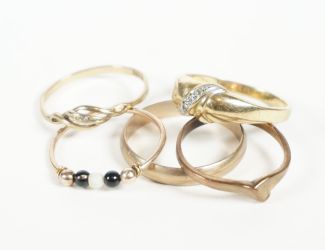 Konvolut von 5, 1x Bandring, 1x zentral 5 bewegliche Kügelchen und 3x zentral Schlaufe bzw gewellt, 2x Splitter, je Beschau, zus ca 7,78gr 333er Gold total, Ringgrößen 54-59