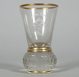 farbloses Glas, goldsilhouettiert, in der Wandung bez „Ch. Van Kempen s/l Br. Hurtzig“ sowie Monogramm BH, H 12 cm, min berieben