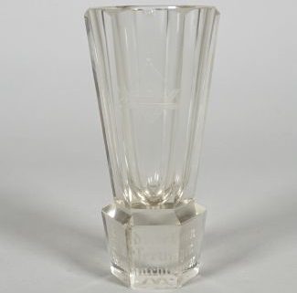 Anfang 20. Jh., farbloses Glas, in der Wandung Logenemblem sowie bez „Gewidmet von M. Wesermeyer. Weihnachten 1927“, im Boden „W“, H. 13,5 cm, 1x Chip an Lippe, kleinere Bestoßungen an Stand, Gebrauchsspuren