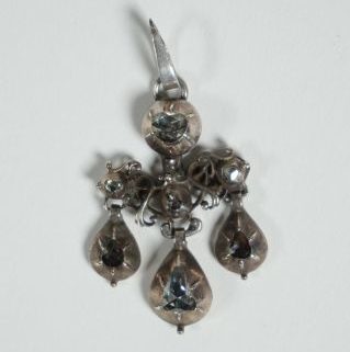 19. Jh., Rokoko Stil, zentral durchbrochen gearbeitete Rocaillen, besetzt mit 4 Rosendiamanten in halbkugeligen Fassungen, bis à ca 0,2ct, unterhalb 3 Tropfenanhänger mit entspr Diamantbesatz, mittig à ca 0,45ct, L. über alles 4 cm, ca 5,9gr Silber total