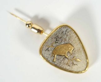 Dreieck mit Vögelchen auf Ast, Hornplättchen als Hintergrund, 2,5 x 2cm bzw L über alles 4,7 cm, Beschau, ca 8,74gr 900er GG gewichtet/total (ohne Pin gewogen)
