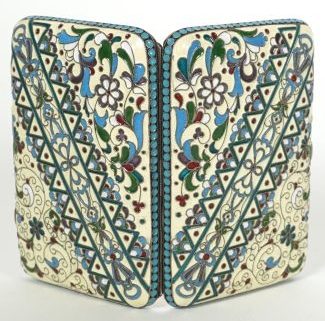 Moskau, 1908-26, Moskau, polychromer Zellenschmelz, allseits Arabesken, Bordüren, umlaufend blaue Punktbordüre, Innenvergoldung, MZ, Beschau, total ca. 188g 88er-Solothnik-Silber, ca. 10,5 x 7 x 1,5 cm (ohne Gummibänder)