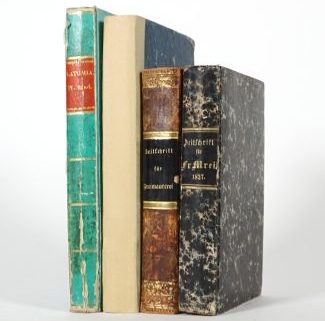 Konvolut von 4, bestehend aus: „Zeitschrift für Freimaurerei“, 2 Bde., Jahrgang 1823/1.-3. Heft sowie Jahrgang 1827/1. Heft, Literatur-Comptoir/Altenburg, „Der Ziegeldecker im Osten von Altenburg. Monatliche Rundschrift für thätige Br. Br. Freimaurer aus allerlei Orienten.“ 1837/1838 und „Latomia“, J.J. Weber/Leipzig, 1844/4. Band, je Pappeinband, 3x goldgeprägt, 1x Rotschnitt, je altersbedingte Lager- und Gebrauchsspuren, tlw gebräunt/fleckig