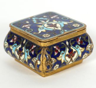 wohl Rußland, um 1900, rechteckiger Stand, entspr. bombierte Wandung, dort und im Klappdeckel polychrom emaillierter Zellenschmelz, Floraldekor, Messingblech vergoldet (berieben), ca. 2,5 x 4,5 x 4,5 cm