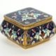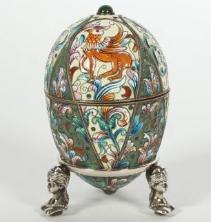 Moskau, 1908-26, allseits polychrom emaillierter Zellenschmelz, tropfenförmige Segmente im Wechsel mit Blumendekor auf grün bzw. hellgelb, 2x Greif, oben u unten je 1 Chrysopras-Cabochon, Innenvergoldung, MZ, Beschau, dazu Ständer, Ring mit 3 Frauenbüsten als Füße, über alles ca. 10 x 6,2 cm, total zus. ca. 205g 84er-Solothnik-Silber