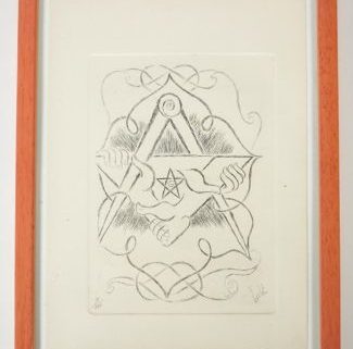 Radierung, Symbolik der Freimaurer, unten links numm 91/200, unten rechts in der Platte sowie handschriftl sign., Plattenmaß 17,5 x 12,5 cm, hinter Scheibe, Kartonmontage, HR