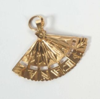 Spanien, Fächerform, bewegliche Glieder, ziseliert und graviert ‚Espana‘, 2,5 x 3 cm, Beschau, ca 1,75gr 750er GG