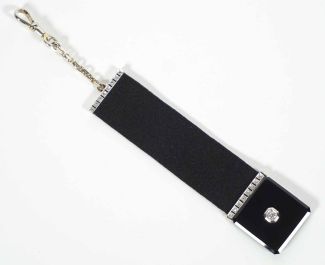 Schweden, tlw Silber, schwarzes Band, oben- und unterhalb Diamantsplitterreihe, endig quadratisches Onyxplättchen mit Brillant, à ca 0,1ct, eingeriebene Fassung, L. über alles 14 cm, Beschau