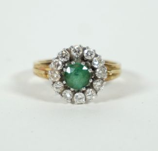 zentral Smaragd, à ca 0,5ct, umlaufend Brillanten, à ca 0,05ct, je WG-Krappenfassung, Beschau, ca 5,83gr 585er WG/GG total, Ringgröße 60