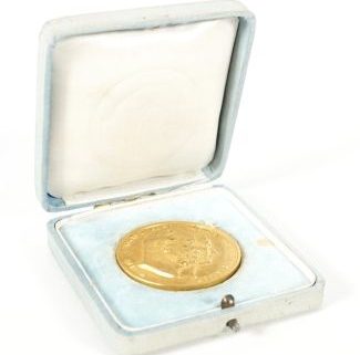 Zur goldenen Hochzeit 1879, Kaiser Wilhelm I u Augusta, vergoldet, Medailleur L. Weigand, Av. Portrait de Kaiserpaares, Rv. Widmung „… Loge Friedrich Wilhelm zur Eintracht i.O. Bremen … Bruder Heinr. Kahle … 1932“ im Lorbeerkranz, Umschrift ca. 38,35g, Dm ca. 4,1 cm, Rv. randig ca. 5 mm angefeilt, in orig, Etui