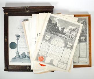Konvolut von 20, England/Schottland, aus 1903-70, Freimaurerische Motive, meist Stahlstiche, u.a. 5x United Grand Lodge, 3x The Surpeme Grand and Royal Chapter of Royal Arch Masons of England, 3x Supreme Council of the XXXIII. Degree, ca. 34,5 x 45,5 bis 46 x 29 cm, meist Faltspuren, 3x Pappmontage, unterschiedliche Erhaltungen, 2x gerahmt (1x mit Applikationen, diese beschädigt)