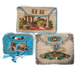 19.Jh., Konvolut von 3, Freimaurerische Symbolik in Perlchenstickerei, 2x Perlchenbesatz, 1x Perlchen- u Stoffstickerei, ca.16,5, x 20,5 bis 11,5 x 16 cm, Innenfutter teilweise verfärbt, 1x Verfärbung unten links rückseitig, Gebrauchsspuren, bei blauer Tasche lösen sich Perlchen, min. besch.