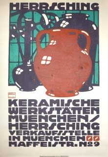 Farblithografie, Plakat „Herrsching Keramische Werkstaetten München/Herrsching …“, um 1910, nahezu farbfrisch, leichte lagerungs- u altersbedingte Verfärbung, Vereinigte Druckereien u Kunstanstalten (G. Schuh) GmbH/München, links mittig drucksign. u bez., ca. 114 x 80 cm, gerollt, im oberen Bereich min. min. stockfl., randig min. besch.