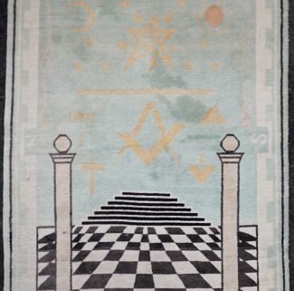 Darstellung eines Logentempels, Freimaurersymbolik, ca. 265 x 100 cm, verblichen, am oberen Rand Flor alt Mottenspuren, Gebrauchsspuren