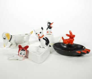 Art Deco Epoche, versch Manufakturen, je polychromiert, bestehend aus: Aschenbecher aus Keramik mit Scottish Terrier, Ablageschale mit Dogge in Art von „Bonzo“, Dackel als Streichholzhalter, Ablageschale mit Vögelchen und kleine Häschen-Nippesfigur, 1x gemarkt, 4 x 5,5 bis 9 x 8 cm,