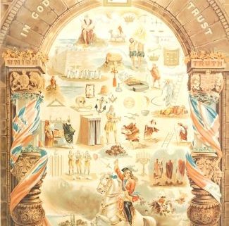 Loyal Orange Constitution/Orange Order Lodge, Farblithografie, Abbildung von Freimauersymbolen u -ereignissen, betitel, bez., ca. 68 x 51 cm, wasserfleckig