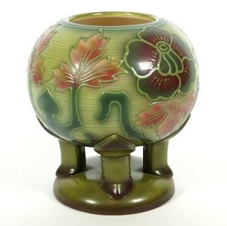 für Steingutfabrik Franz Anton Mehlem/Bonn, Jugendstil Epoche, Vase, Steingut, polychromiert, gedrückte Kugelform auf vier Stützen über rundem Standfuß, in der Wandung Blüten und Blätter, H. 14,8 cm, braune Stempelmarke sowie purpurne Formnummern und div Pressmarken, am Stand minimalst altbest.