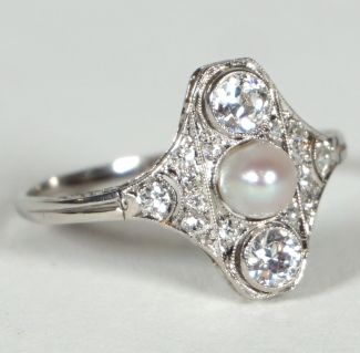 Art Deco Epoche, zentral Perle, ober- und unterhalb je ein Brillant, à ca 0,15ct, H/I, VS2, weiterer Diamantbesatz, ca 3,2gr 750er WG (getestet) total, Ringgröße 60