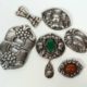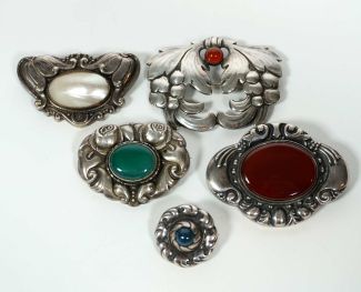 Konvolut von 5, 1910er/20er Jahre, 4x Silber, 1x versilbert, versch Manufakturen und Formen, je Floraldekor, zentral div Schmucksteine ua Perlmutt, Karneol und Aventurin, 2,5 x 2,5 bis 4,8 x 6,5 cm, je Beschau, meist MZ