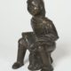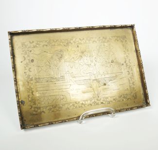 China, Messing, rechteckige Form, umlaufender Rand in der Kante profiliert, im Spiegel Gravur einer Genreszene im Blütenrahmen, ca. 19,5 x 28 x 1,3 cm