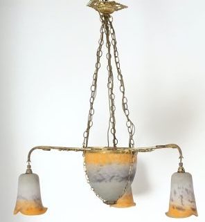 späte Jugendstil-Epoche, Frankreich, Kettenaufhängung, zentral davon gehaltene halbovoide Lampenschale, orange-lila Pulvereinschmlezungen, 3 Arme, endig je entspr. kelchförmiger Lampenschirm, Messingbaldachin, entspr. Gestell, alt elektrifiziert (keine Gewährleistung), über alles ca. 75 x 60 cm