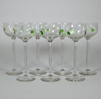 Satz von 7, Kristallglasmanufaktur Theresienthal, Jugendstil Epoche, farbloses Glas, in der Kuppa Blumenschliff mit aufgesetzten grünen Blütenpunkten, H. 21 cm, 1x an Lippe Flohbiss