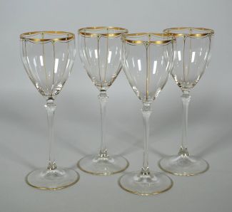 Satz von 4, Jugendstil Epoche, Scheibenfuß mit Nodusschaft, Kuppe mit Golddekor sowie maigrünem Rautendetail, H. 20 cm, tlw min berieben