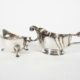WMF/Geislingen an der Steige, 4 tlg., versilbert, Historismus-Epoche, Birnenform auf ausgestelltem Fuß, unterseitig godroniert, umlaufend Reliefband mit Reserve, kanelliert geschweifte Schultern, 2 x Klappdeckel, je mit Akanthusdekor, C-Henkel, S-Tüllen, MZ, Beschau *