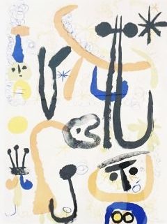 Farblithografie, „Personajes y Animales“, li. unten num. 40/75, re. unten sign. und dat. 1950, Blattmaß 76 x 56,5 cm, Passepartoutmontage, WVZ: Miró Lit./Bd. I, Nr. 97, Kartonmaß 94,5 x 75 cm, wellig