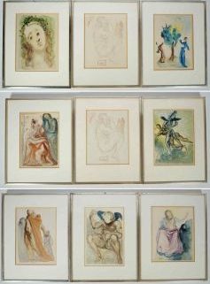 Farblithografien, Satz von 9, Illustration zu Die Göttliche Komödie, je ca 25,5 x 16,5 cm, hinter Glas, Schrägschnittpassepartout, SR (tlw leicht verkratzt)