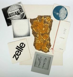 Prägedruck, Abstrakte Komposition, aus dem Zyklus „povaha projevu“ (Art der Rede), rechts unten bez, rechts unten sign und dat (19)63, Blattmaß 48,5 x 31 cm, Klapppassepartoutmontage, verso Galerieetikett, verschobener Lichtrand, dazu 4 Broschüren ua Ausstellung Galerie Zelle/Reutlingen 1969 mit Radierung von Svoboda J. Matej und „Josef Hampl – Serial aus der graphischen Werkstatt“ mit Prägedruck von 1969