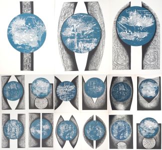 Lithografien, Satz von 15, Planetenkompositionen aus Zyklus Planet, je links unten num 4 bzw. 5/5, 5 bzw. 6/10 u 1x 6/15, 1x Gefälligkeitswidmung „srimu priteli wolfhardovi venuja“, rechts unten sign. u dat. (19)67, verso betitelt u 14x bez. I – XI, XIII – XV, Blattmaß ca. 70 x 50 cm, randig leicht stockfleckig, Ränder mit Lagerspuren