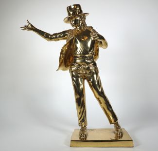 Bronze, poliert, Michael Jackson in Pose, auf rechteckiger Plinthe, dort ritzsigniert und numm 99, H über alles 54 cm