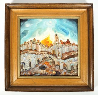 Öl/Holz, Blick auf Altstadt von Jerusalem mit goldener Kuppel des Felsendoms als Sonnenaufgang, links unten monogr., 30 x 31,5 cm, HR