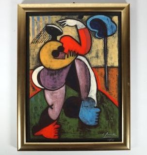Farblithografie, Frauenporträt in der Art des Kubismus, rechts unten sign und numm 22/26, 48 x 35 cm, hinter Glas, GR (dort verso Künstlerstempel)