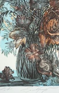 Farblithografie, Üppiger Blumenstrauß, unten links bez E.A. und unten rechts sign., verso auf Rahmen Gefälligkeitssignatur, -widmung und -datierung 1999, Plattenmaß 25 x 17,5 cm, hinter Glas, PP, GR