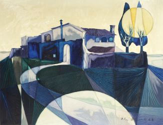 Öl/Lw., Mas Catalane/“Clair de la Lune“,rechts unten sign und dat (19)67, verso bez, betitelt und sign., 58,5 x 74,5 cm, Schattenfugenrahmen, tlw Farbabplatzer in der Malschicht